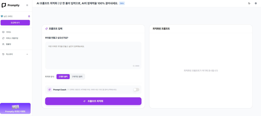 Promptly.im에 접속해서 간단히 가입 또는 로그인하세요. 플랜 선택 후 바로 사용할 수 있습니다.